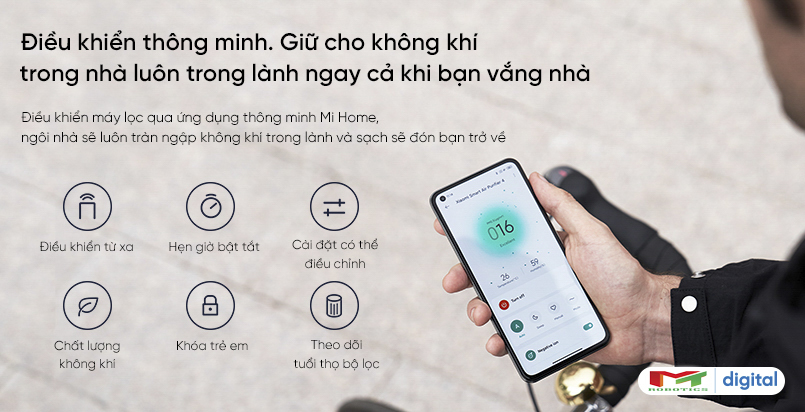 Máy lọc không khí Xiaomi Air Purifier 4 điều khiển từ xa thông qua App Mi Home rất thông minh, người dùng có thể hẹn giờ thời gian bật/tắt máy, giám sát chi tiết tình trạng chất lượng không khí khi máy đang hoạt động. Hơn nữa, khách hàng sẽ biết được thông tin lúc nào cần thay thế bộ lọc mà không hề phải mở máy để kiểm tra thông qua với ứng dụng Mi Home được kết nối trên điện thoại thông minh.