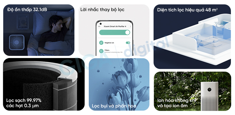 Tương tự như Purifier 4 Pro, sản phẩm máy lọc không khí Mi Air Purifier 4 nhờ tích hợp công nghệ ion âm hiện đại giúp giải phóng các ion âm và có thể hút các phần tử mang điện tích dương (bụi, khói) trung hòa chúng đảm bảo rơi xuống đất, giúp đem lại bầu không khí sạch sẽ, trong lành, vô cùng thoáng mát cho ngôi nhà, bạn có thể tận hưởng cảm giác thoải mái hơn sau một ngày dài làm việc mệt mỏi.