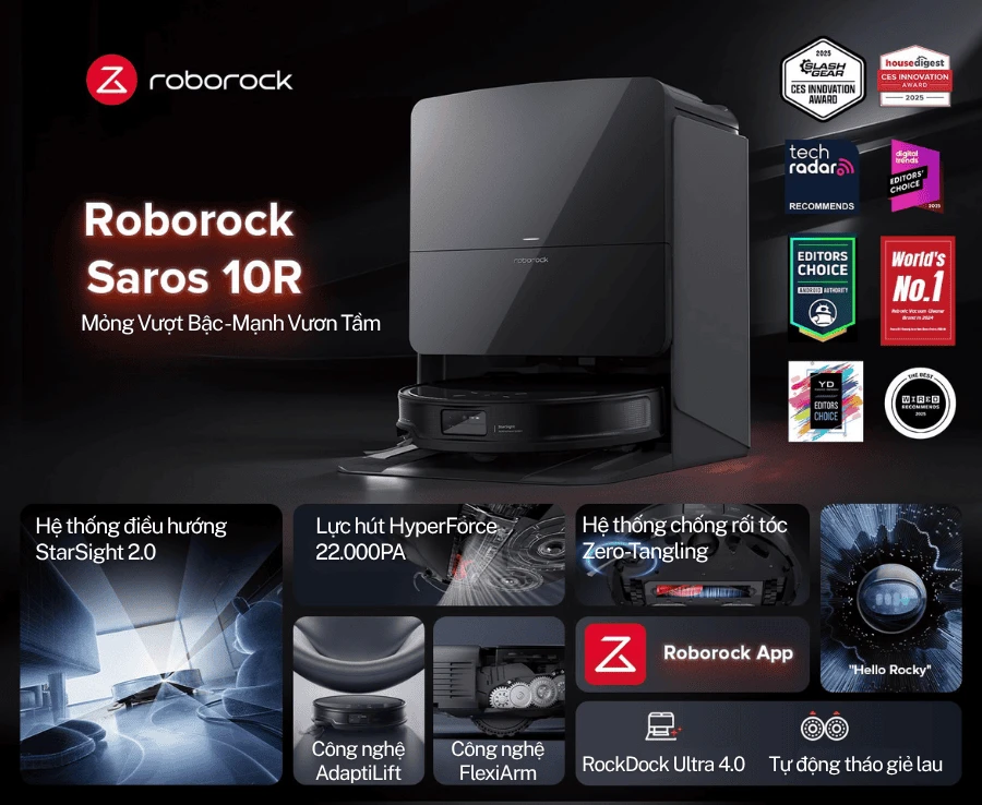Robot hút bụi lau nhà Roborock Saros 10R là sản phẩm flagship 2025 của thương hiệu robot hút bụi Roborock đình đám mới được giới thiệu tháng 10/2024. G20S Ultra đóng vai trò là sản phẩm flagship mới nhất nên Roborock đã tích hợp những công nghệ, tính năng tinh hoa nhất có thể kể đến là: Công nghệ AdaptiLift™ nâng khung gầm lên 4cm, Stone Star Array® Pilot 2.0 hệ thống điều hướng thông minh 3 tích hợp vượt trội được tích hợp vào bên trong thân robot với thiết kế siêu mỏng chỉ 7.98cm, Chổi chính DuoDivide hoàn toàn mới, khả năng thu gom rác, tóc và lông thú cưng hoàn hảo.