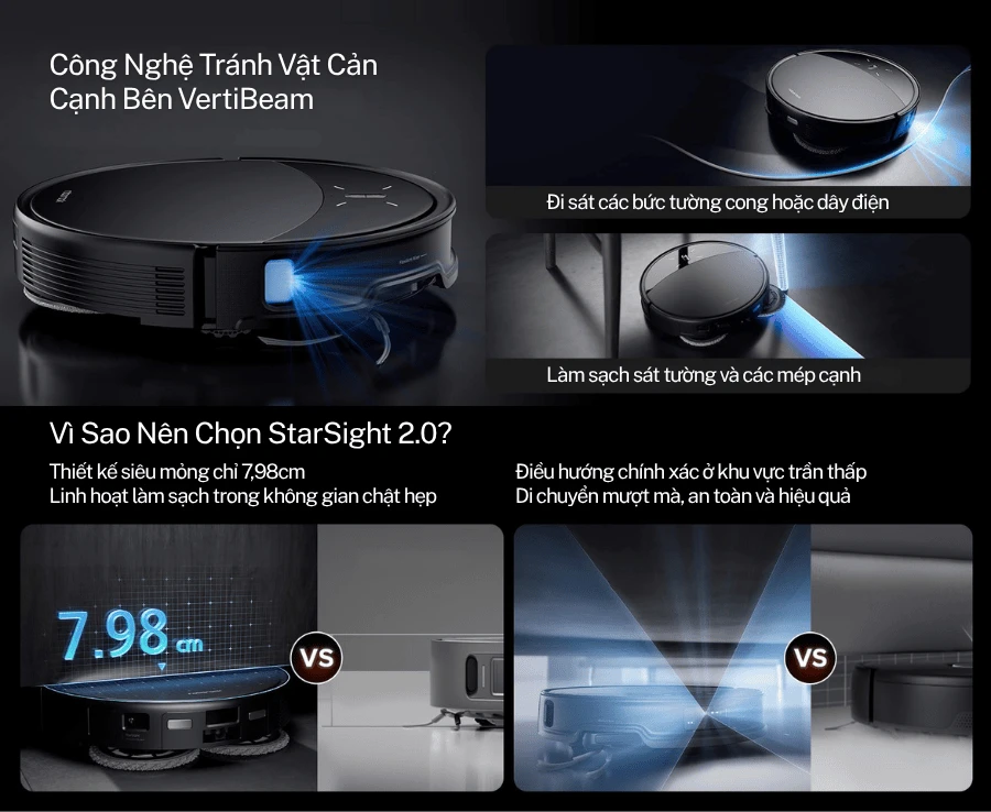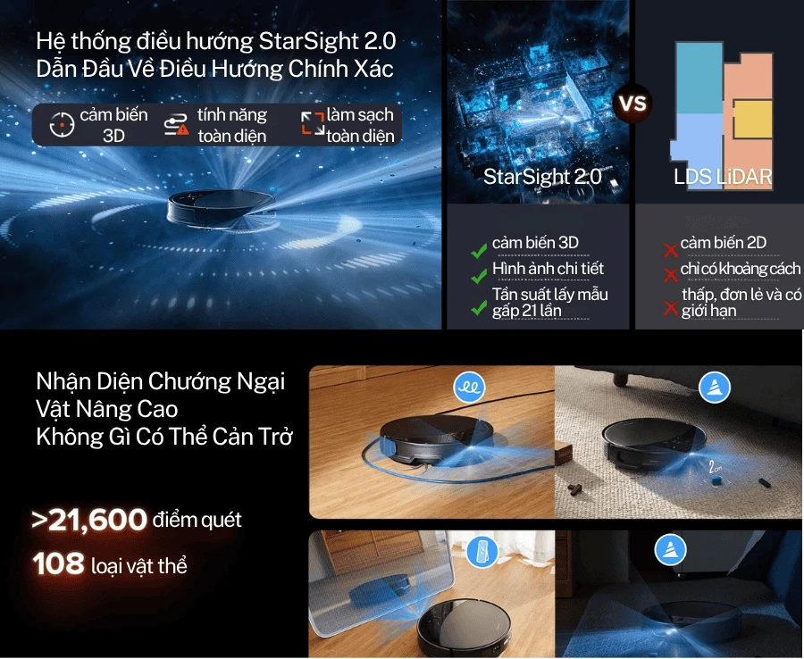 Nhờ công nghệ điều hướng StarSight 2.0 kết hợp cảm biến 3D và hệ thống LDS có thể thu gọn, robot đảm bảo làm sạch kỹ lưỡng từng ngóc ngách.